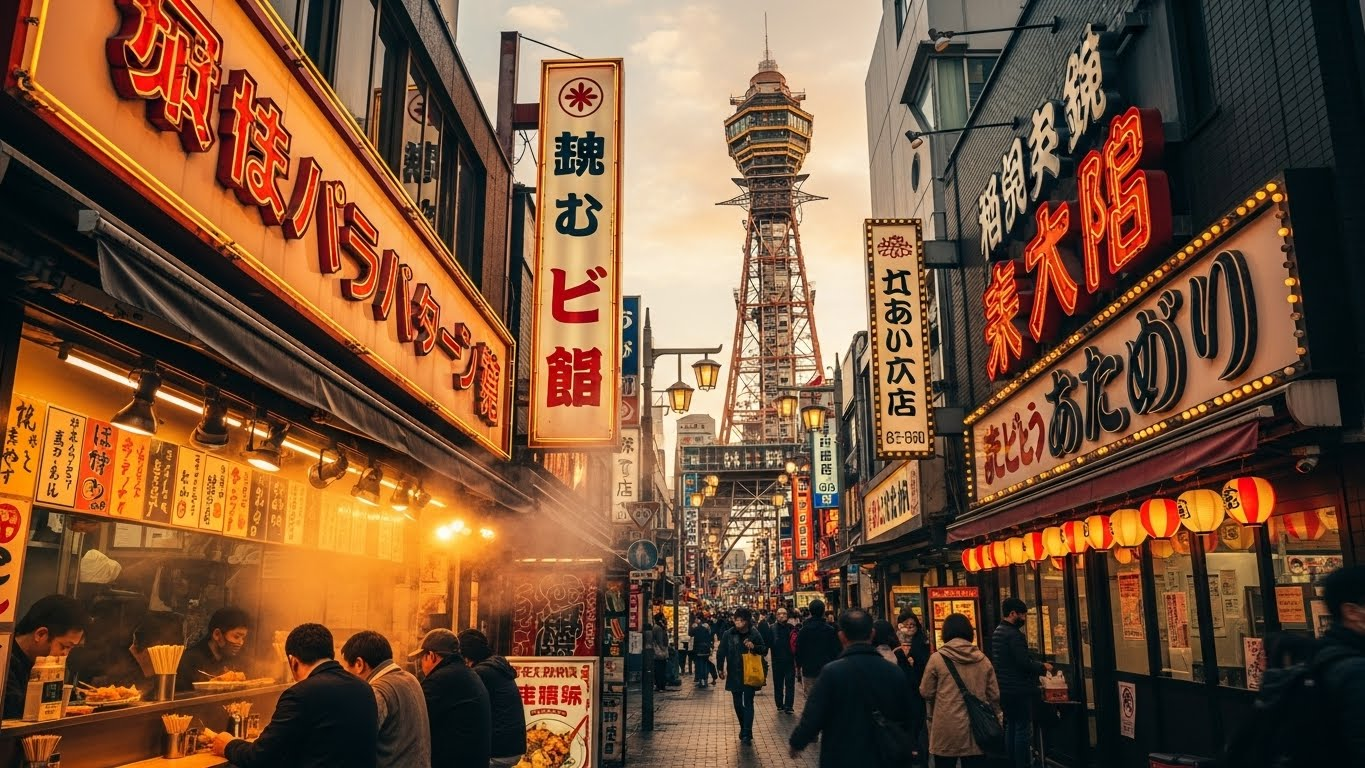 도쿄의 차가움, 교토의 고요함 사이, 오사카만의 활기찬 균형이 보인다.