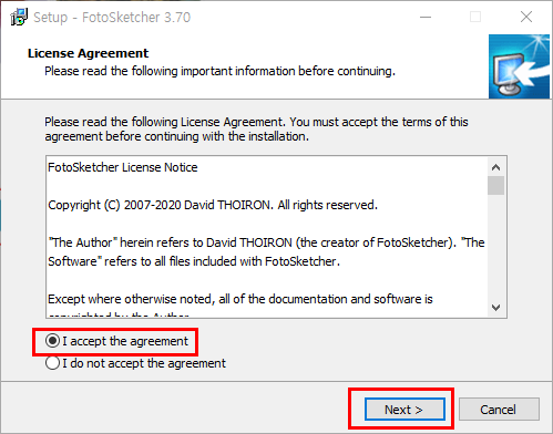 5.I accept the agreement 선택하고 Next 버튼을 클릭합니다.