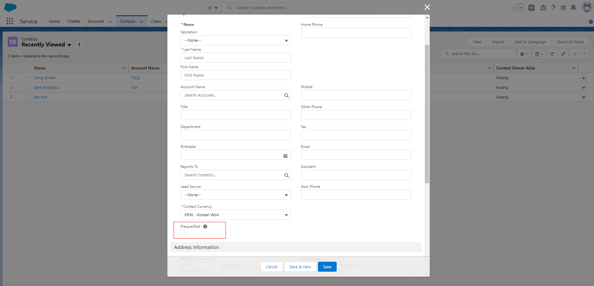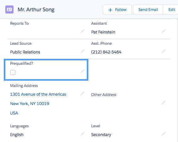 이 변경을 수행하기 위해 D'Angelo는 연락처 개체에 대해 미리 한정된 확인란을 만들고 싶습니다.