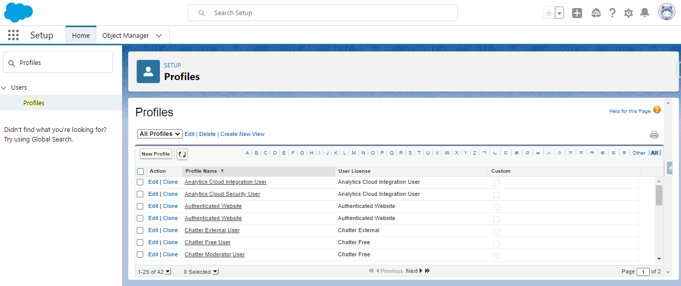 Profiles은 사용자의 App 접근, 탭 접근, 객체의 등록, 수정, 삭제 권한, 접속 시간 제어, 네트워크 접속 대역 설정등을 제어 합니다.