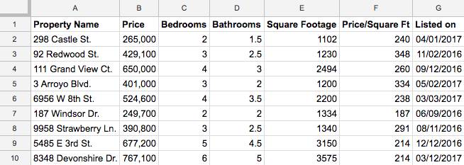 데이터베이스에 익숙하지 않은 경우 스프레드시트에 데이터를 저장하는 방법을 생각해 보십시오.예를 들어 D'Angelo는 스프레드시트를 사용하여 DreamHouse의 모든 속성을 추적할 수 있습니다.열은 주소, 비용 및 기타 중요한 속성을 저장할 수 있습니다.행은 DreamHouse가 판매하는 각 속성에 대해 이 정보를 저장할 수 있습니다.데이터베이스 테이블도 비슷한 방식으로 설정됩니다.