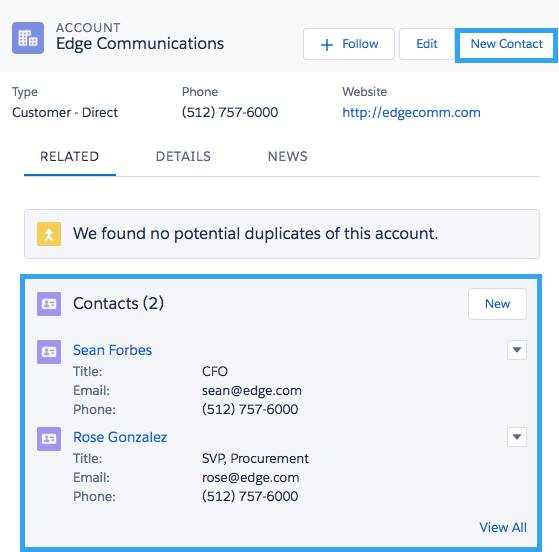 Salesforce에서 계정 레코드를 보면 관련 탭에 연락처 섹션이 있음을 알 수 있습니다.계정에 연락처를 빠르게 추가할 수 있는 버튼도 있습니다.