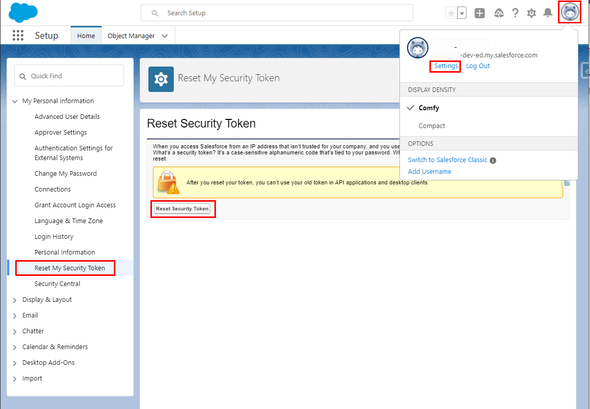 - In the menu on the left, under Personal Setup, expand My Personal Information, and then click Reset My Security Token.