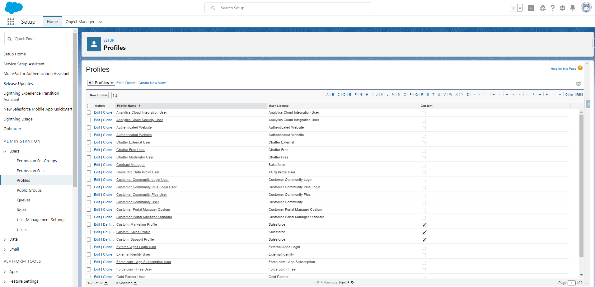 프로필도 객체와 같이 Standard와 Custom 프로필로 나누고 동일하게 Standard 프로필은 수정 할 수 없습니다.
