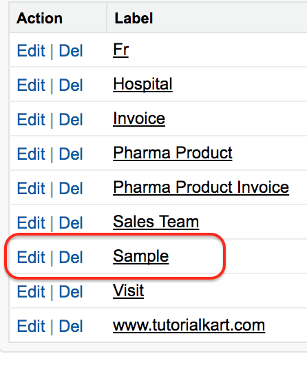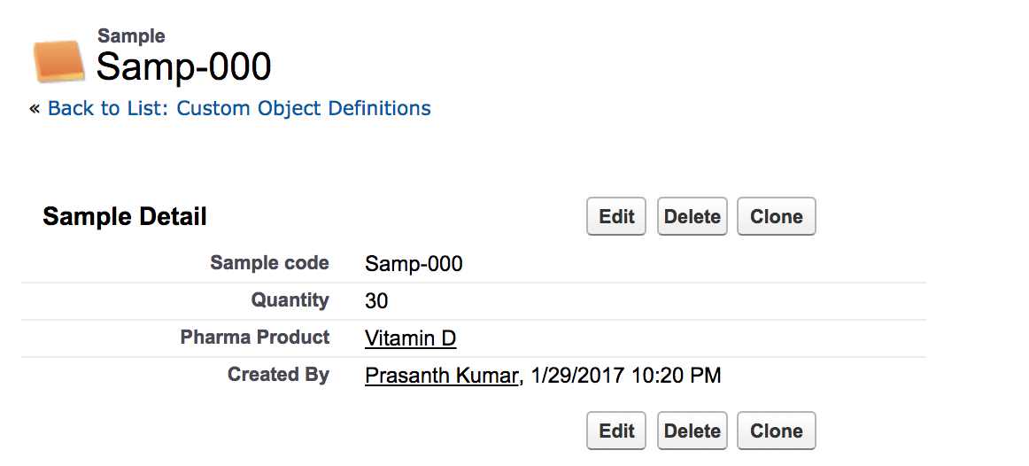이제 샘플 개체로 이동하여 클릭합니다. 이제 개체 정의 페이지가 표시됩니다. 이제 사용자 정의 필드 및 관계로 이동하십시오.