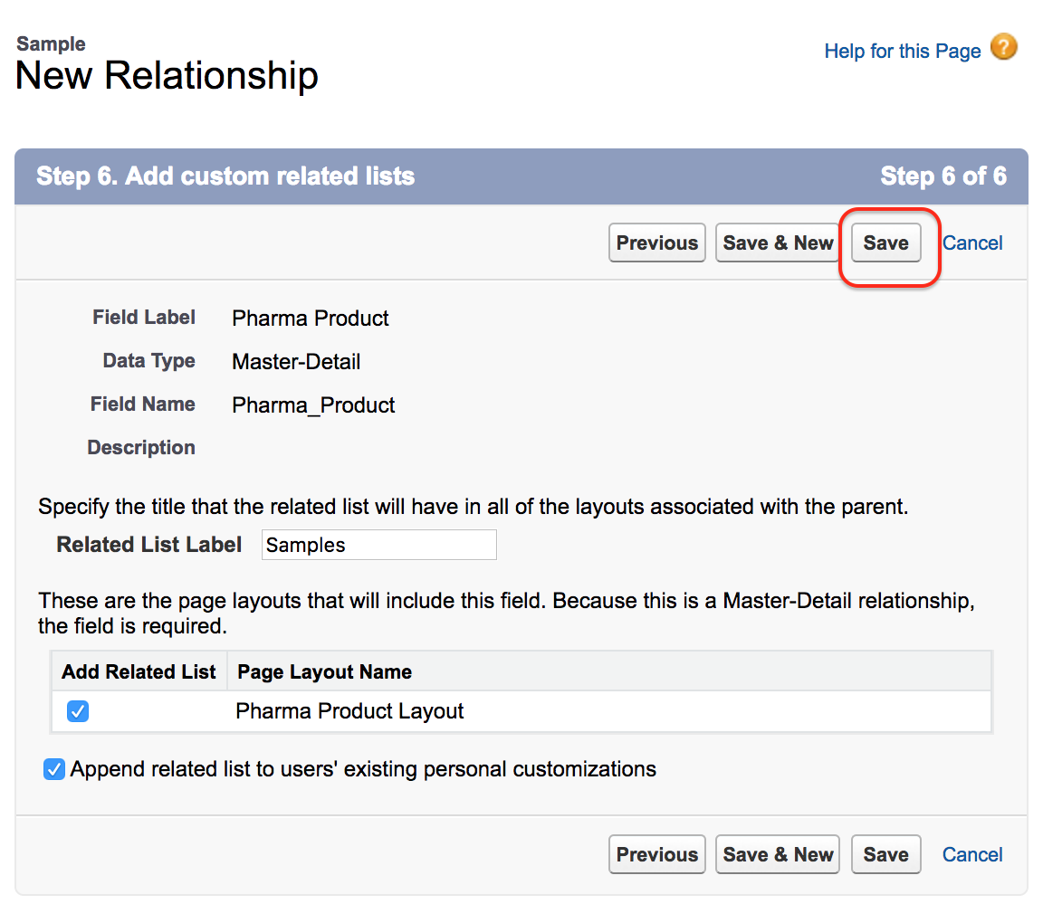 이제 Pharma Product 와 Sample 간의 Master-Detail 관계 생성 이 성공적입니다. 마지막으로 저장 버튼을 클릭하여 모든 설정을 저장합니다.