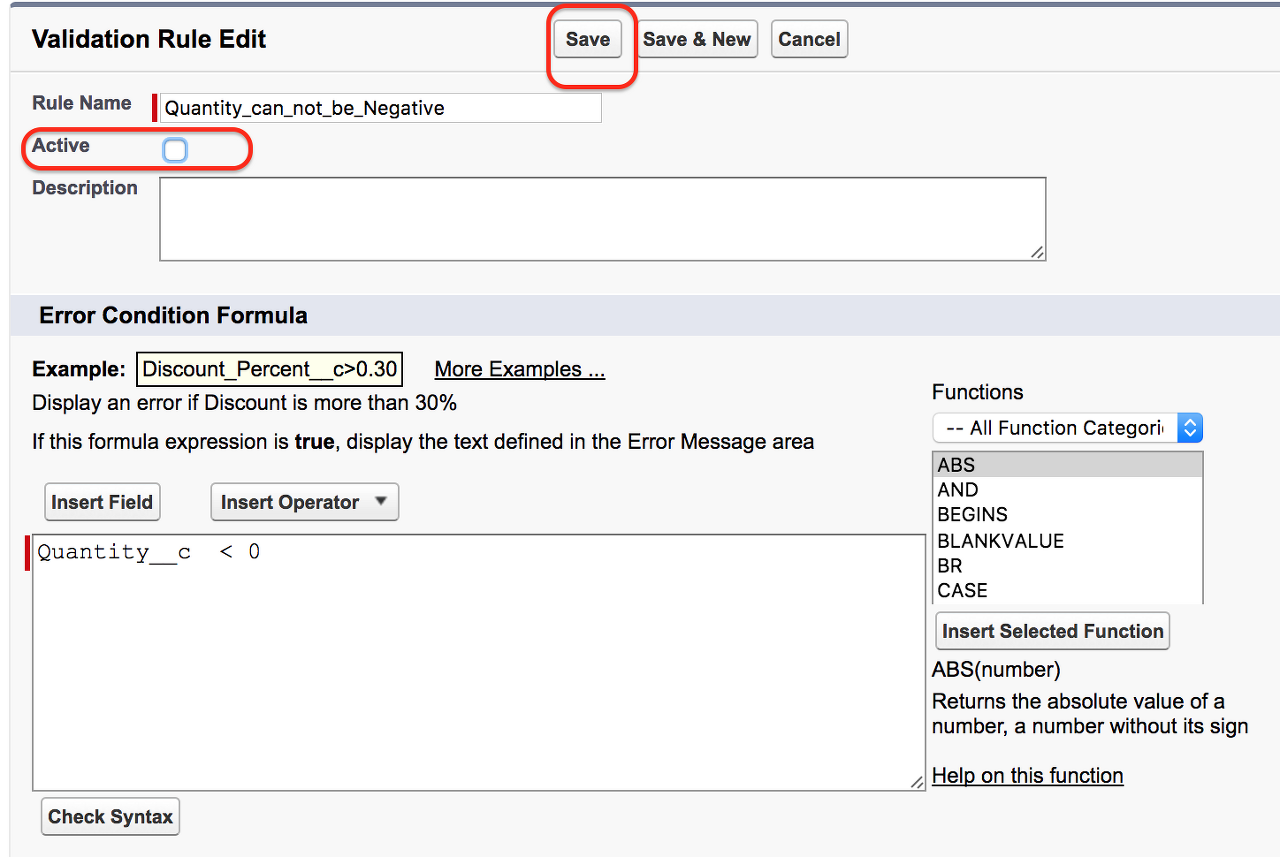 - Salesforce에서 유효성 검사 규칙을 비활성화하려면 활성 버튼을 선택 취소하십시오.