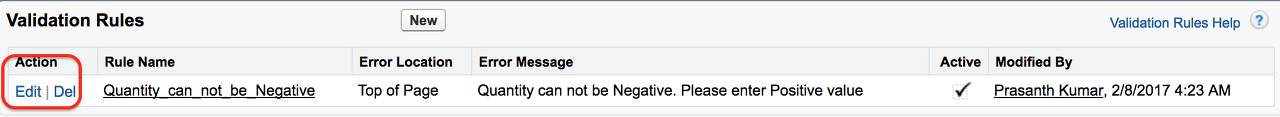 Salesforce에서 유효성 검사 규칙을 만든 후에는 수량에 음수 값을 입력할 수 없습니다. 음수 값을 입력하면 위와 같이 페이지 상단에 오류 메시지가 표시됩니다. 수량 필드가 양수 값인 경우에만 레코드가 저장됩니다.
