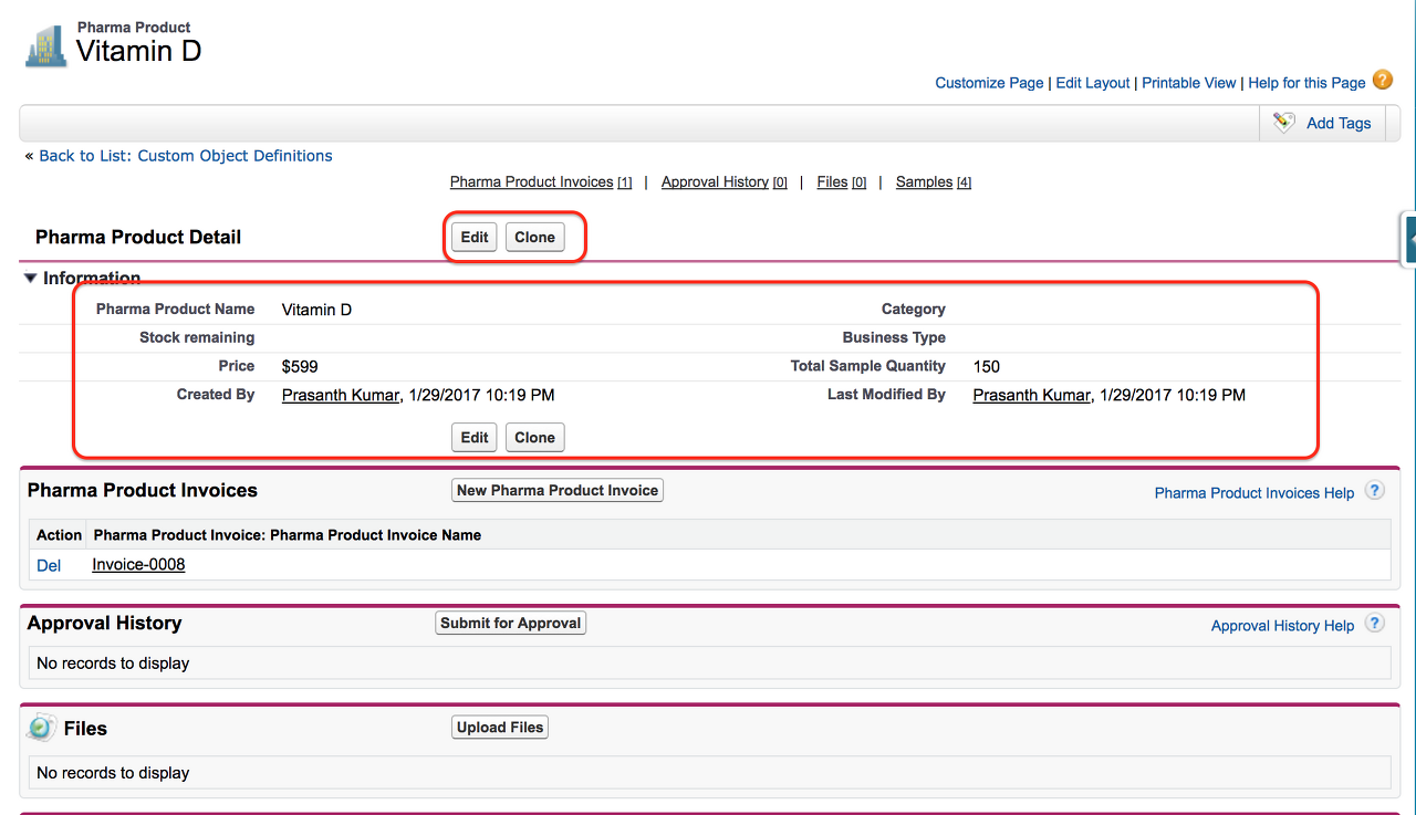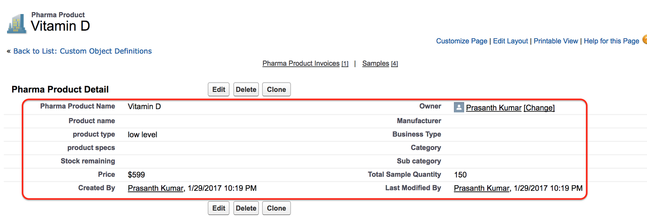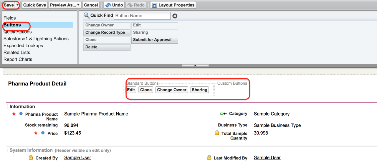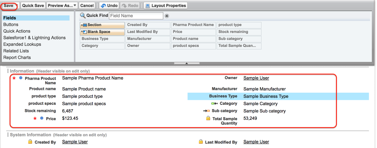 저장 버튼을 클릭하면 위와 같이 새 페이지 레이아웃 편집기가 표시됩니다. 여기에서 필드, 버튼, 사용자 정의 링크 및 기타 관련 목록을 사용자 정의할 수 있습니다. 위에 표시된 것처럼 이 New Pharma Product 페이지 레이아웃에서 삭제 버튼, 소유자 변경, 레코드 유형 편집을 제거했습니다.