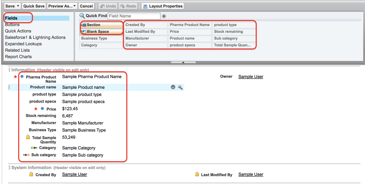 Salesforce의 페이지 레이아웃이 편집되면 위와 같이 사이드 바에서 필드, 버튼, 빠른 작업 Salesforce1 및 번개 작업, 확장 조회, 관련 목록, 보고서 차트를 관찰할 수 있습니다. 필드를 클릭하면 위에 표시된 것처럼 Pharma Product 개체에 있는 필드에 액세스할 수 있습니다.