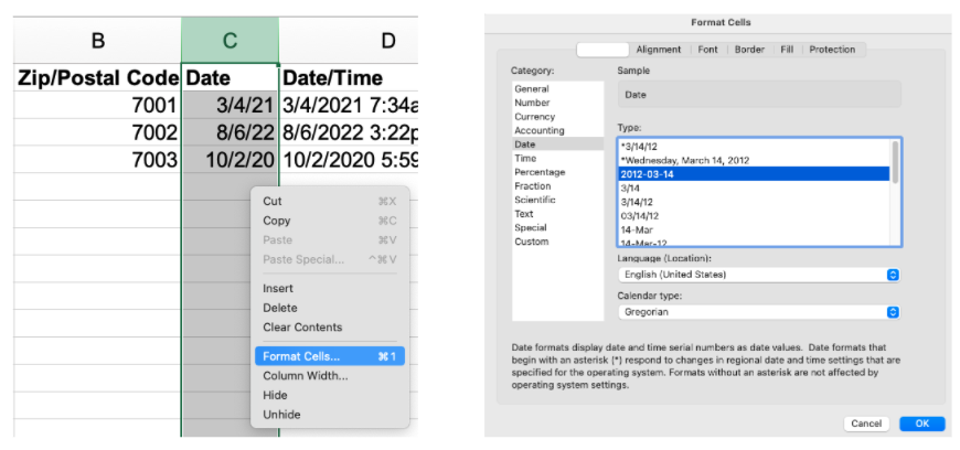 이러한 흥미롭고 유용한 모든 공식에서 한 걸음 물러나 셀 서식을 올바르게 지정하고 Salesforce가 각 필드 유형에 대해 어떤 유형의 값을 볼 것으로 예상하는지 아는 것만으로도 데이터 품질을 개선하기 위해 할 수 있는 일이 많이 있습니다. 이것은 새로운 관리자에게 매우 흔한 실수입니다(저도 여러 번 해왔습니다!). 셀(또는 필요에 따라 열/행)을 마우스 오른쪽 버튼으로 클릭하기만 하면 됩니다.