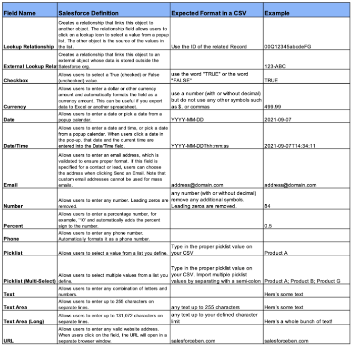 시작할 때 도움이 될 수 있는 CSV 형식 필드에 대한 기본 가이드를 작성했습니다. 이들은 가장 일반적인 필드입니다. 확실하지 않은 경우 샌드박스에서 테스트하십시오. 프로덕션에서와 마찬가지로 샌드박스로 CSV 가져오기를 수행할 수 있으므로 가져오기 오류가 발생하는지 확인하고 프로덕션 가져오기를 수행하기 전에 수정하는 것이 좋습니다.