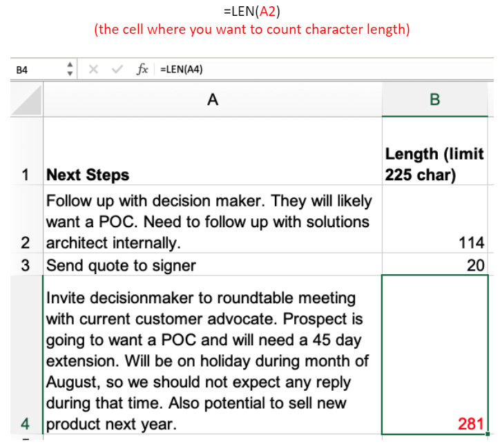 몇 달 전 저는 운이 좋게도 새로운 Salesforce 인스턴스로 작업할 수 있었습니다. 영업 팀에는 그 시점까지 스프레드시트에 나열된 아주 적은 수의 기회가 있었습니다. 이제 Opportunity에는 글자 수 제한이 있는 여러 필드가 있습니다. 특히 Opportunity Name 및 Next Step 필드가 특히 그렇습니다. LEN은 너무 많은 문자가 있는 셀로 인해 오류가 발생하지 않도록 하려는 경우에 매우 유용합니다.