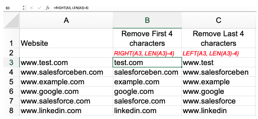 이것은 내가 셀에서 처음 4개 문자 또는 마지막 3개 문자와 같은 것을 제거해야 할 때 내가 가장 좋아하는 것입니다. 이 예에서는 일부 웹사이트 URL을 사용합니다.