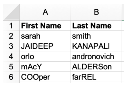 Salesforce로 가져오기 위해 얻는 모든 사람 목록에는 "이름과 성이 포함되기를 바랍니다. 그러나 때때로 당신이 얻는 것은 일종의 혼란입니다. 여기 이 목록과 같습니다. 이러한 이름을 있는 그대로 가져올 수 있지만 문제가 있습니다. 이름 또는 성을 포함하는 자동화된 이메일을 보내는 경우 수신자는 즉시 다음 사항을 알게 됩니다.