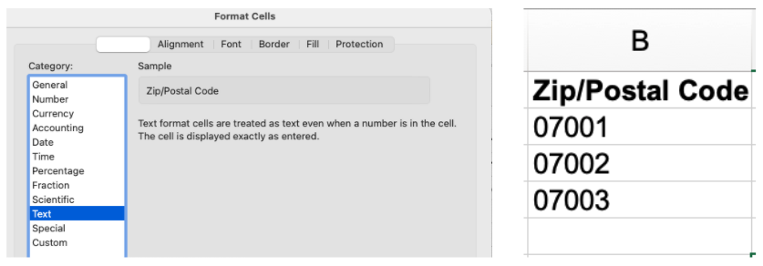 스프레드시트에서 선행 0을 유지하려면 형식을 텍스트 로 설정하십시오 .