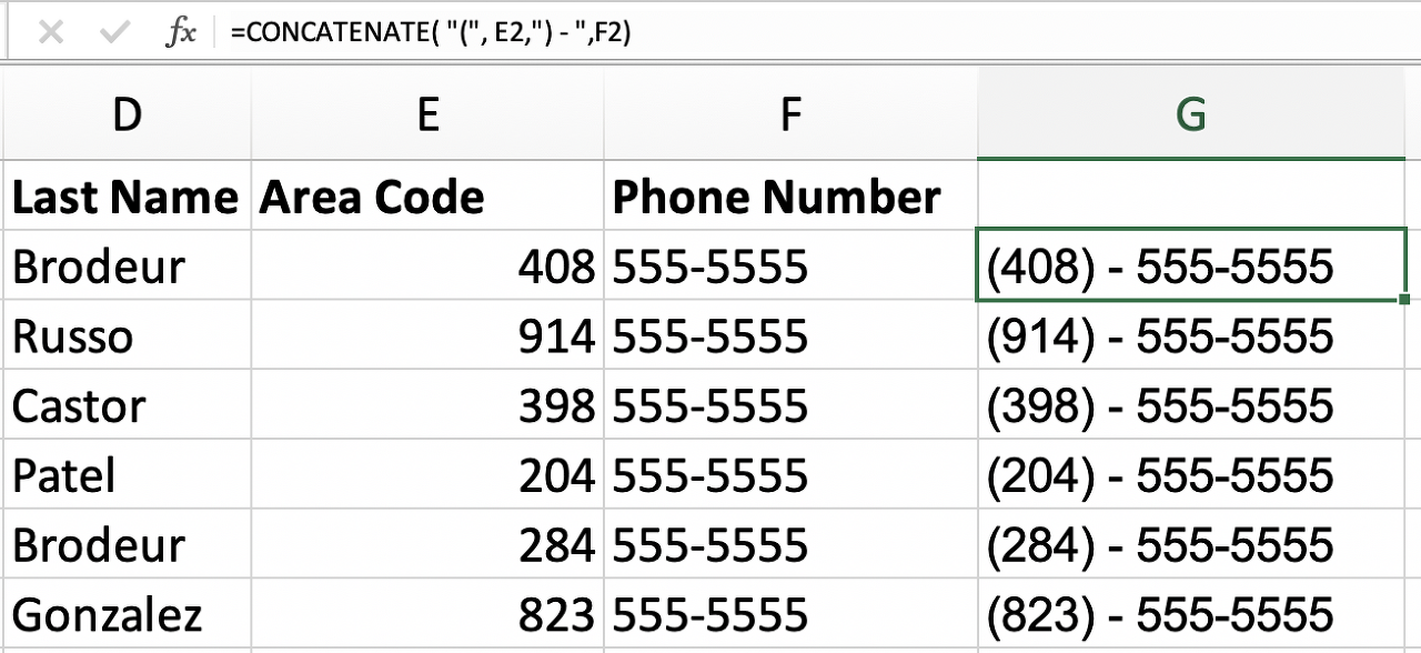공백이나 문자도 추가해야 합니다. 추가하려는 텍스트(공백 포함)는 따옴표로 묶고 쉼표로 구분하여 추가해야 합니다. 이 예에서 내 지역 번호와 전화 번호는 별도의 셀에 있습니다. 이 둘을 결합하고 지역 번호 주위에 괄호로 서식을 지정하고 싶습니다.