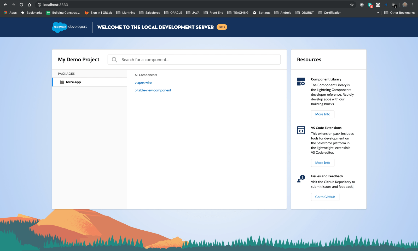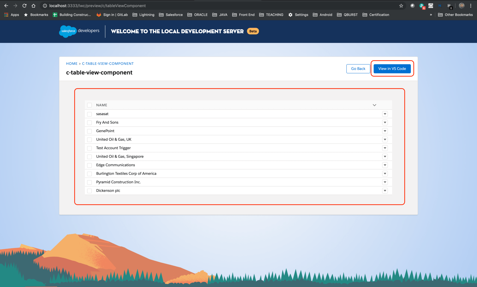 As shown above, a local web server has been created for mocking the salesforce context. First screen list all of the lightning web components in your project. You can search for a components and select the component you want.