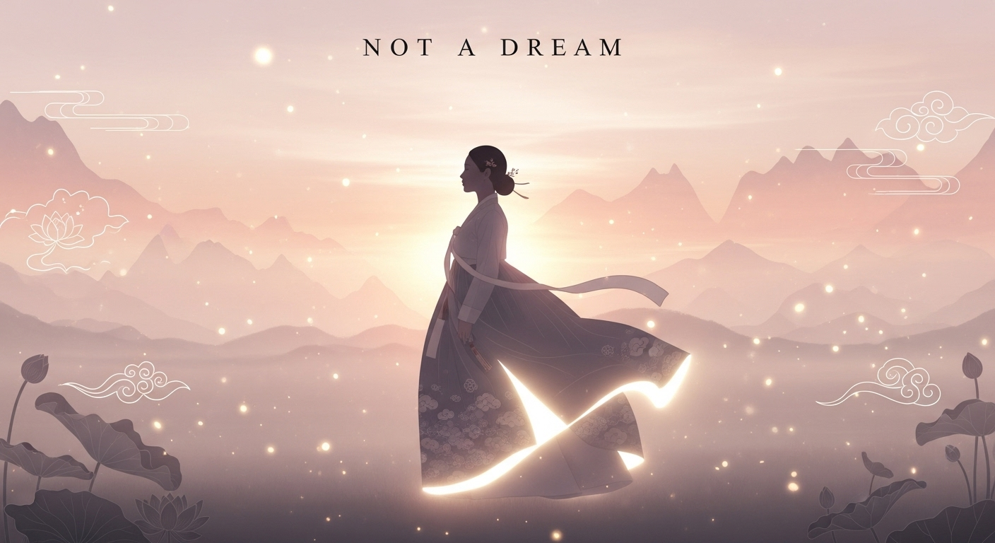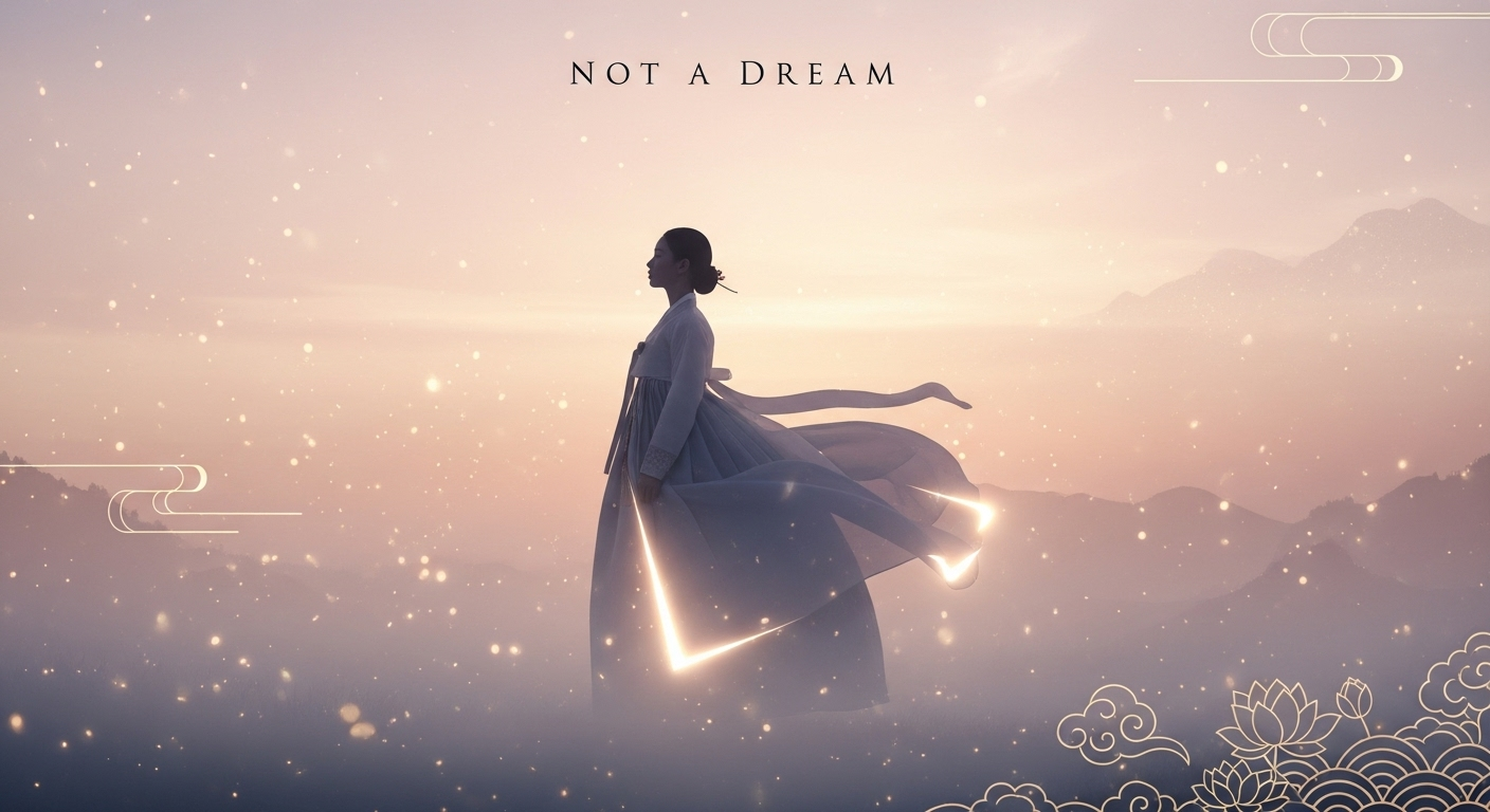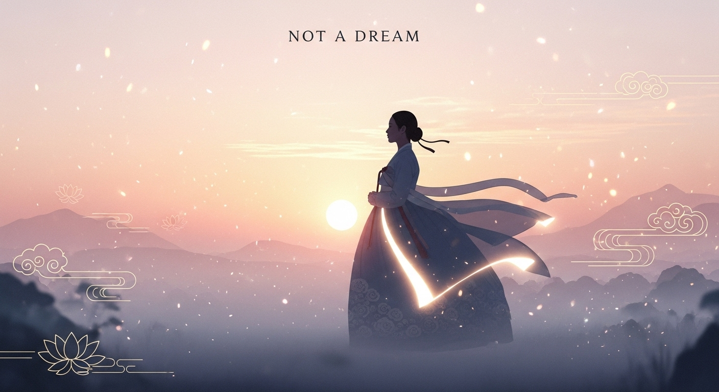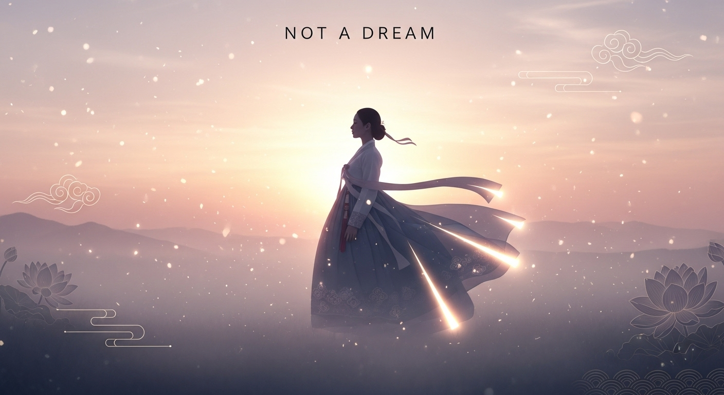 파스텔 톤의 하늘, 빛 입자, 연꽃과 구름 문양 같은 한국적 요소를 은은하게 표현.